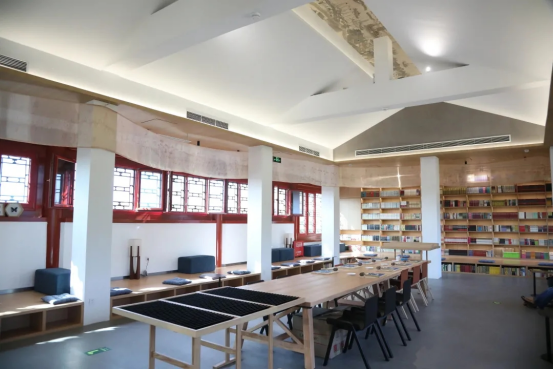 書店位于城市綠心森林公園北區(qū)驛站。室內(nèi)的空間設(shè)計上,用印有清代運河全圖的曲線飄帶,打造出運河流域地理造型,將“運河文化”主題貫穿整個書店,讓“運河概念”在室內(nèi)空間中“活”起來,提升書店主題的場景感,重述古老運河在新時代蘊含的故事,為讀者提供更舒適的閱讀環(huán)境、更完善的閱讀服務(wù)、更全面的閱讀體驗。