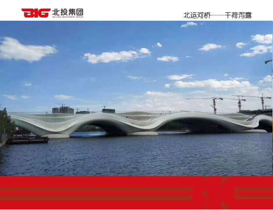 大橋全長360余米,其中主橋長210米,引橋長約150米,橋體鋼梁結(jié)構(gòu)總重8000余噸。該橋梁封護系統(tǒng)為雙曲面FRP夾心板,造型優(yōu)美,雅名“千荷瀉露”,橋體按功能劃分三個區(qū)域:腹部、流水平臺和梯道步道區(qū)域。該橋建成后,有夜景燈光,有潺潺流水,動靜結(jié)合,營造了水鄉(xiāng)的文化意境,增強了生態(tài)感受,以低姿態(tài)形式映襯了北運河的同時,展現(xiàn)出極為豐富的藝術視覺效果。這是我國首次在橋梁建筑上大規(guī)模使用FRP材質(zhì)建造。