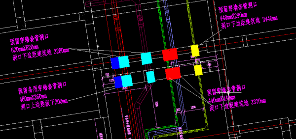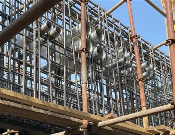 (4)機(jī)電預(yù)埋:項(xiàng)目人防區(qū)域兼做車庫(kù)應(yīng)用,一次結(jié)構(gòu)的預(yù)埋管件數(shù)量及種類繁多,在機(jī)電管線深化的起始階段,針對(duì)各專業(yè)圖紙進(jìn)行全面識(shí)圖,結(jié)合施工規(guī)范,對(duì)預(yù)埋套管的具體加工尺寸進(jìn)行統(tǒng)計(jì)。應(yīng)用BIM技術(shù)在管綜基礎(chǔ)上進(jìn)行預(yù)埋套管的模擬排布,其中強(qiáng)弱電預(yù)埋套管的大部分皆穿越人防門(mén)頂部,在此處需進(jìn)行精準(zhǔn)深化預(yù)埋。